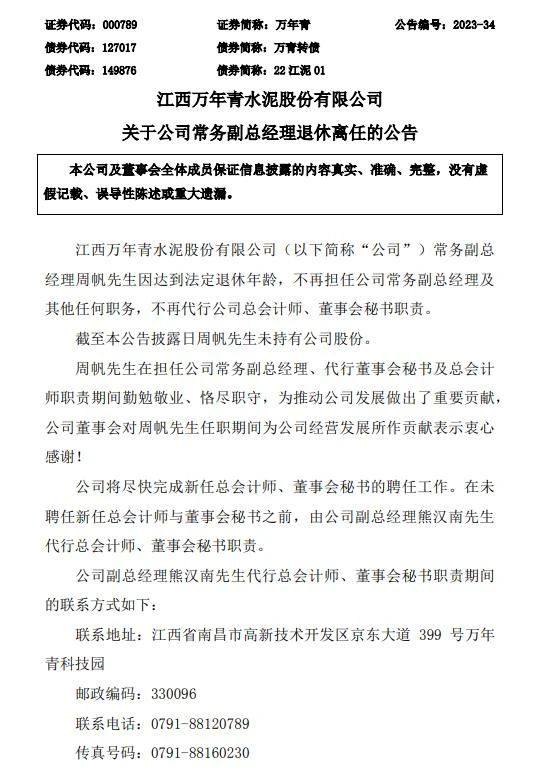 8月3日,萬年青水泥發布公告,江西萬年青水泥股份有限公司(以下簡稱“公司”)常務副總經理周帆先生因達到法定退休年齡,不再擔任公司常務副總經理及其他任何職務,不再代行公司總會計師、董事會秘書職責。